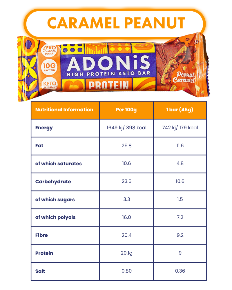 Topped with crunchy peanut pieces and coated in real milk chocolate, this Keto-friendly high-protein bar delivers a rich caramel flavour with a satisfying Adonis crunch. Low in sugar and only 4g net carbs, it keeps your energy steady while keeping carbs low — thanks to clean ingredients, fibre, and naturally sweetened, Keto-approved goodness.